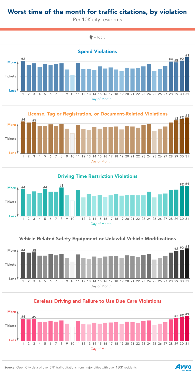 For every variety of violation,the concentration of tickets at the beginning and end of the month held true. In fact, the 30th and 31st were the most common days of the month for every kind of ticket. At the start of the month, the first and third days also witnessed unusually high ticket activity. These days ranked fourth and fifth respectively for the following violations: careless driving and failure to use due care, safety equipment or altered vehicle violations, and license, tag or registration, or document-related violations.